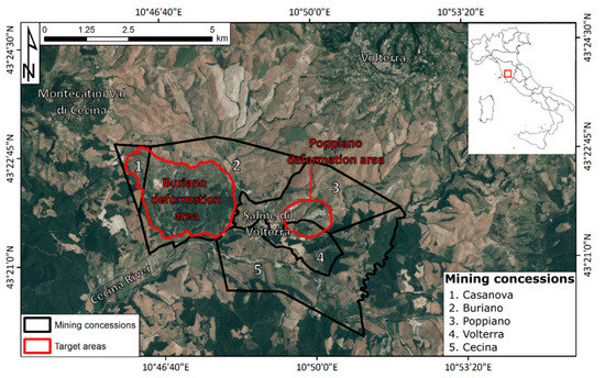 Localization of the area of interest and of the mining concessions in the surroundings of Saline di Volterra in the Volterra Municipality. The background image is a 20 cm AGEA orthophoto (from [46]).