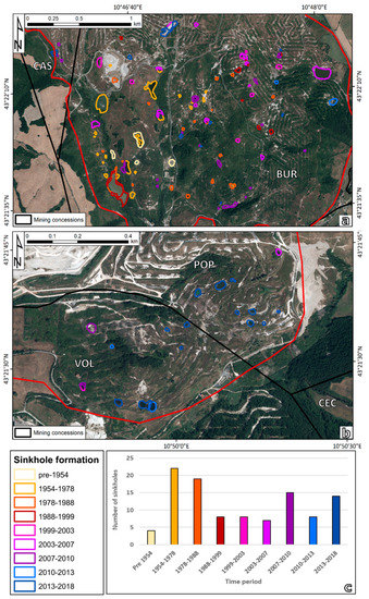 Sinkholes catalogue for the mining concessions of Buriano-Casanova (a) and Poppiano-Volterra (b). The background image is an AGEA 2018 orthophoto (Table 1). The distribution of boreholes for temporal periods is presented in inset c. Sinkholes with contour variations are counted as their first appearance.