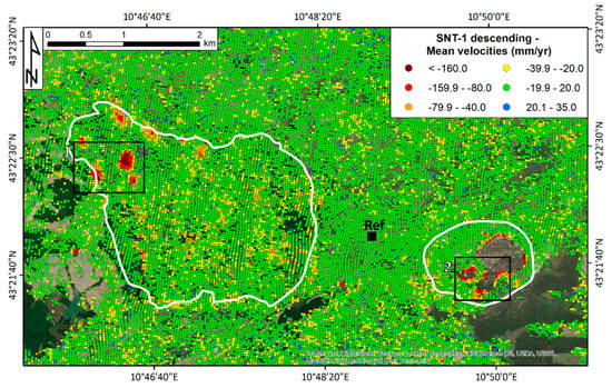 The deformation map is classified on the basis of the average velocity values, expressed in mm/yr. A stability threshold of ±20 mm/yr was defined to highlight the subsidence bowls within the two mining areas. This threshold is defined depending on the standard deviation of the velocities, here equal to 2.5 times such value. A classical red-green-blue scale bar is used to classify the deformation map; yellow to dark red points refer to movements away from the sensor with negative sign, light blue points refer to movements through the sensor whereas green points fall within the stability threshold. All the measurements are referred to the LOS and are differential values, i.e., referred to a reference point assumed as stable. The reference point was selected in the urban area of Volterra in correspondence of the main road crossing the hamlet, where the oldest edifices are built. To the knowledge of the authors, the area is stable as confirmed also by other interferometric data available for the whole Tuscany Region [46,66].