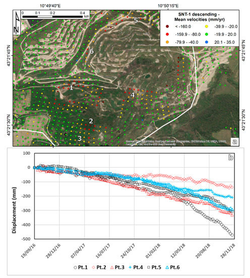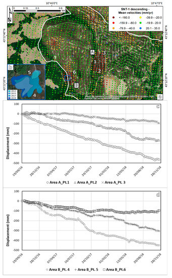 The time series of deformation extracted for the points with the highest deformation rates along the internal border of the high deformation areas are presented in Figure 7b (points 1,2,4,5, and 6). All these time series highlight an acceleration with different magnitudes in the last months of the monitored period. The breaking point is located between June and August 2018.