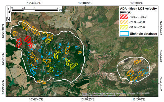 A hot-spot like analysis is performed to extract the biggest subsidence bowls from the deformation map presented in Figure 5 and to compare their spatial distribution with the sinkhole database. Such analysis is based on the concept of active deformation areas (ADA) defined by Barra et al. [68]. An ADA defines a moving area composed of a certain number of moving measurement points that are aggregated on the basis of neighboring criteria. Moving means that the LOS velocity of a measurement point is above a threshold defined by the user. The software tools developed by Navarro et al. [69] are used to perform the ADA extraction.