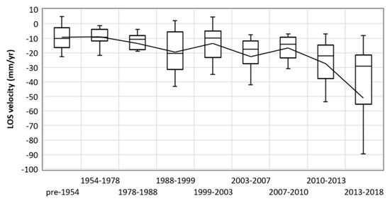In order to assist the interpretation of the results, the pure evaluation of the average velocity values is associated to the information regarding the age of formation of the sinkholes. The results are presented in Figure 9. The box plot is showing the median, minimum, and maximum values of the LOS velocities of all the measurement points included in the sinkholes of each temporal interval. The graph shows an evident increase of the deformation rates for the most recent sinkholes. The oldest temporal intervals (before 1988) show very similar velocity distributions, with median values around −10 mm/yr. LOS velocities regularly increase until the period 2010–2013, when a strong increase of the maximum velocities is recorded.
