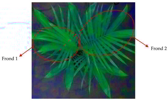 Figure 2 shows the top view image of frond 1 (F1) and frond 2 (F2). In order to minimize variations in spectral reflectance due to the effects of frond inclination [], only the spectral reflectance of the first four leaflets of F1 and F2 were extracted manually and randomly. The usage of F1 and F2 followed the work of Shafri et al. [] and Izzuddin et al. [] due to the morphological arrangement of the fronds. Therefore, an average of 20 sample points were obtained from each frond, resulting in a total number of 558 and 564 sample points for F1 and F2, respectively. The outliers of the data were identified using the box plot method. Box plot analyzed the data statistically in a graphical manner with five measured parameters representing the distribution, i.e., lower quartile, upper quartile, lower fence, upper fence, and interquartile range. These quartile ranges were advantageous due to their reduced sensitivity towards outliers [,].