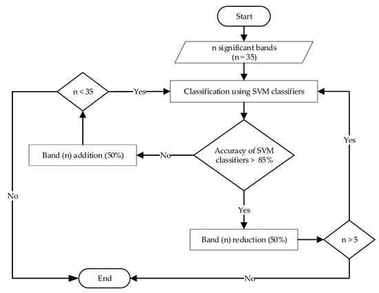 After the classification models were constructed, an optimization process was carried out to find the optimal number of bands that could give suitable classification accuracy. Exploration runs were applied where the initial number of significant bands was optimized, as shown in Figure 3. Thirty-five significant bands that were confirmed to be statistically significant were used as inputs of the SVM classifiers. If the classification accuracy obtained by all SVM classifiers was greater than 85%, the current number of significant bands was reduced by 50%. Otherwise, if the condition was not satisfied, the current number of significant bands was increased by 50%. The classification models of the reflectance spectra were developed separately for F1, F2, and the combination of F1 and F2 (F12) using the respective significant bands.