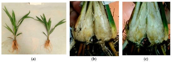 Figure 4 shows the condition of the oil palm seedlings that were sent to the Bacteriology Laboratory, Faculty of Agriculture, UPM for PCR test to confirm G. boninense infection. Both samples tested positive for G. boninense infection, although the seedlings displayed no apparent symptoms associated with BSR disease such as fungal mass and yellowing of older leaves. However, longitudinal sectioning of the bole showed brown discoloration indicating the presence of the G. boninense infection. Furthermore, Figure 5 shows the condition of I seedling after 20 weeks of artificial inoculation. The seedling also did not show any visible symptoms related to G. boninense infection, as stated in Izzati et al. []; Kok et al. []; Naidu et al. [] despite being inoculated with the G. boninense pathogen.