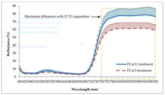 Spectral reflectance of frond 2 (F2) at U and I treatments. Each value represents a mean of 197 and 264 sample points of U and I treatments, respectively. Vertical bars represent standard deviation.