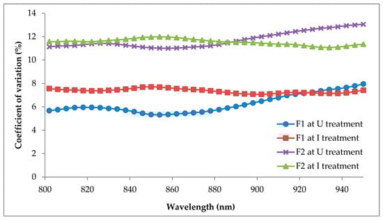 The CV of all sample points of the significant bands for F1 and F2 are shown in Figure 8. The CV values were in the range of 5 to 14% and were considered to be good and reliable []. Based on the figure, the sample points of F2 demonstrated more variation than F1 at the significant bands (800 to 950 nm).