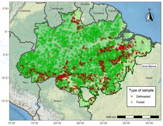After defining the sampling spaces, a simple operation performed using the stratified sample routine of the GEE API allowed us to randomly sample 3000 locations in the invariant sample space and 3000 locations in the deforested area sample space. These locations are shown in Figure 2.