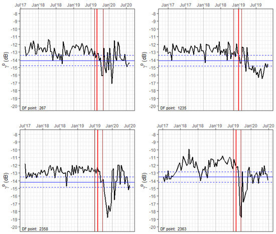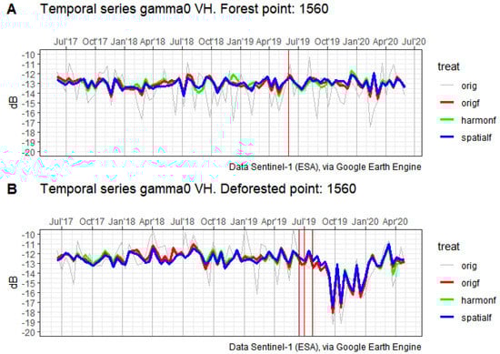 Regarding SAR response to the deforestation process, some studies [35,36,37,38] point out that there is an ambiguity in the sign and intensity of the SAR signal change immediately after forest degradation. This change would be positive or negative, depending on the local management practices, the type of SAR sensor, and the span of time between measurements. Following on from this, Watanabe et al. [38] report an increase of 1.2 dB in ALOS 2-PALSAR 2 HH backscattering values in the early stages of deforestation, followed by a decrease of 1.2 dB in HV backscattering values after the fallen trunks were removed from the deforested patch. Meanwhile, the results of a recent simulation [39] indicate a decrease in backscattering after clear-cutting or selective logging in temperate forests. A complete field study in Peru’s Madre de Dios area [40] reported a significant decrease in L-Band HV backscatter in forest patches subject to logging and/or deforestation. Additionally, a clear decrease in both L-band and C-band cross-polarized backscattering values was found in Bolivian dry forests subject to deforestation [29]. This decrease would be short-termed in the case of the C-band measurements. More recently, Bouvet et al. [41] found a short-term (~5–6 months) decrease in deforested C-band VV values, similar to the patterns reported in an Indonesian deforested tropical forest [28]. Thus, we can conclude that, for C and L-bands, there is an overall decrease in SAR backscattering measurements following a deforestation event, which can be quite short-termed (4 to 6 months), in the case of the C-band time series.