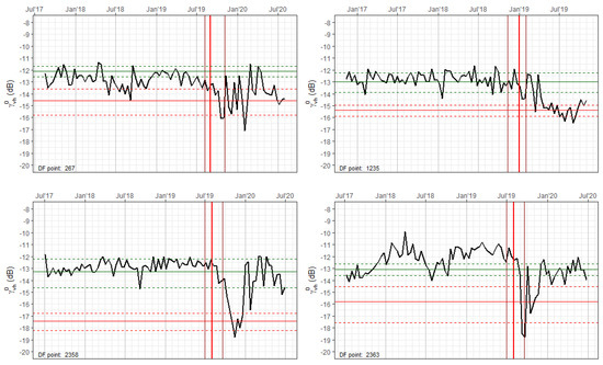 Other than ionospheric effects [12], weather and seasonal-related conditions of the surface can considerably affect SAR measurements modifying time-series characteristics [13]. This can lead to erroneous or erratic automatic change detection results. SAR variability can be either due to long-term factors, such as seasonal droughts and rain scarcity, and to short-term events, such as storm surges or heavy-regional rains. Several authors have studied the susceptibility of SAR measurements to dense rain cells [14,15,16], to intercepted precipitation water in the canopy [17,18,19,20], and to canopy moisture [21]. The magnitude of these effects heavily depends on the wavelength of the SAR sensor (Table 1).