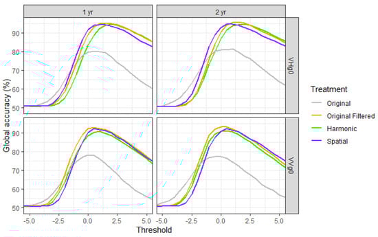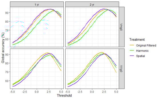 Following (8), we defined the forest threshold using (a) a set of training samples, extracted from the invariant forest locations, and (b) a set of training samples extracted from the deforested locations samples predating the deforestation event (soon-to-be deforested series). Then, all the TS were thresholded using the computed value for both cases. In order to optimize the detection performance, we tested the detection performance of a set of thresholds around the value.