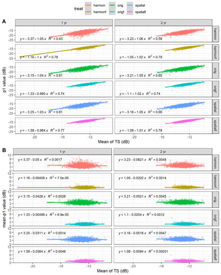 These instabilities can be treated using different approaches. One straightforward approach consists of the mathematical treatment of the time series, using temporal pixel-wise moving windows [26] or harmonic functions [28]. Although this approach is powerful in an operational context, it can be misleading, as it will not account for the interannual variability of rain and temperature regimes. For instance, a harmonic fit trained in a humid year would probably overestimate backscatter values in the next, drier year, and would not deal properly with short-term variations of backscattering due to heavy-rain episodes. A spatio-temporal approach to stabilization was proposed in [29]. In that work, the authors use the regional backscatter P95 percentile value to define a mean forest response for every recorded date and then to normalize all the image pixels by this value. This approach has an added advantage: it will deal with sensor oscillations as those reported in [30]; however, it can be difficult to apply to large regions. Other mitigation techniques make use of global, high-frequency rainfall records to mask measurements made during or after heavy rain episodes [26,27]. Meanwhile, masking using globally available coarse resolution data, such as NASA’s Integrated Multi-satellitE Retrievals for GPM (IMERG) 10 × 10 km hourly rainfall can mask too many valid measurements contained in a rainy cell [27]. The use of fine spatiotemporal resolution meteorological data, such as those made available by meteorological radars, and an attenuation model, such as the one proposed in [14], can help to overcome this problem [16]. Unfortunately, fine spatiotemporal resolution meteorological data are far from being widely available over entire tropical basins. Recently, a hybrid random forest model, using meteorological and forest structure data, has been successfully applied to stabilize data over a medium-sized region in Eastern Amazon [31]. Although the proposed method is very promising, it does not account for undocumented variations in S1 calibration, such as those reported in [26], and it can fail to model extremely heterogeneous regions such as the entire Amazon basin.