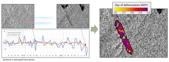 Regarding backscattering SAR-CD techniques, early attempts used manual thresholding to detect changes in forest cover [64]. Expectation–Maximization techniques [65] have been successfully applied in automatic thresholding [66]. A robust, generalized version of the Kittler–Illingworth thresholding method [67] to classify non-filtered and filtered ratio images of C and X-band data led to good results in filtered data on an agricultural-forest landscape. Generalized Gaussian (GG) models for the change and no-change classes in the log-ratio image, following a moment-based estimation method, have been used with good results [68]. An operational and reliable method based on Bayesian probability applied to deseasonalized backscattering time-series analysis is proposed in [69]. Applications can be reviewed in [28,29], which report excellent values of user accuracy (96.8%) and producer accuracy (95.8%) using Sentinel-1 VH data, although non-forest classes characterization is somewhat unclear. These allegedly constitute today’s most accurate methods and will form the core of RADD (Radar Alerts for Detecting Deforestation), a forthcoming EWS method based on SAR data [70]. Other SAR-CD amplitude approaches, such as the one recently proposed in [71], are been used to complement the Bayesian approach. In the approach in [71], VV and VH change information to form a Polarimetric Change Vector (PCV), which can be helpful to discriminate the type of detected changes. This method seems promising to identify degradation types such as those caused by fire and flooding.