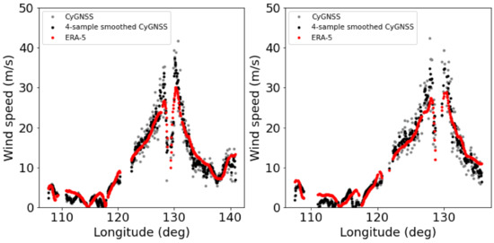 CyGNSS passes acquired during the typhoon ‘Trami’ in 29 September 2018, geographically close to the eye of the cyclone and within hours of the acquisition of a Sentinel SAR wind speed images—as shown in Figure A1, Appendix B. Our 1 Hz CyGNSS wind retrievals are plotted in grey dots (black dots after four sample–∼28 km–smoothing). The red dots are for ECMWF/C3S ERA5 wind speeds interpolated to the CyGNSS tracks. The tracks correspond to CyGNSS satellite numbers/track identification numbers: 01/722 (left) and 06/703 (right).
