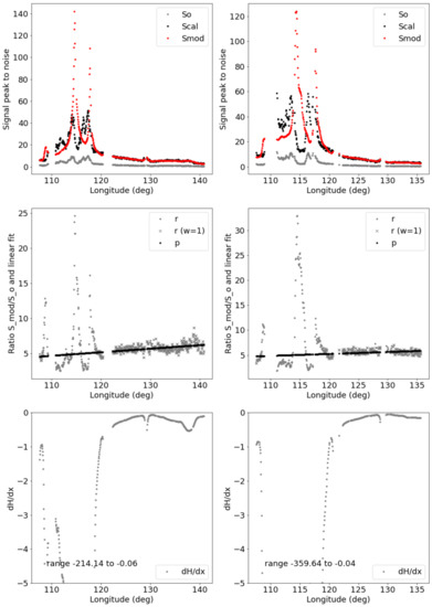 where is a slowly varying function of the longitude of the specular point, , and p is obtained as the weighted polynomial fit of the ratios r