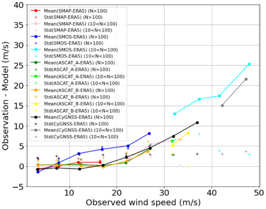 Statistics of satellite observations with respect to ERA5 wind estimates, in batches of 5 m/s. Dots that are connected with lines correspond to the mean , with dispersion given by its standard deviation (crosses). Different colors are used for different satellite observations, and for windows with statistically significant () or non-significant () number of samples: black and grey for our CyGNSS retrievals (statistically significant and non-significant, respectively), red and pink for SMAP-ERA5, blue and cyan for SMOS-ERA5, green and lime for ASCAT_A-ERA5, and orange and yellow for ASCAT_B-ERA5.