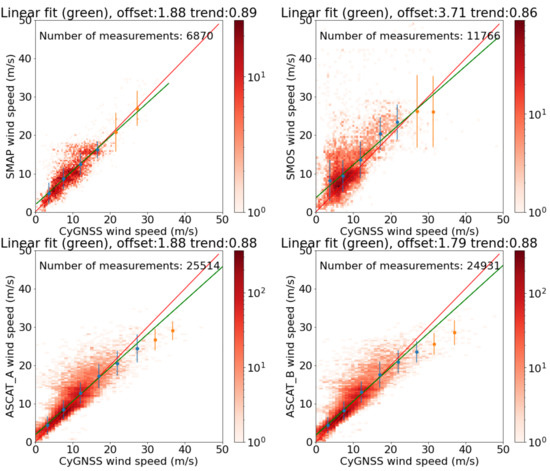 In this section, we present the direct comparison between our CyGNSS wind retrievals and the wind measurements obtained from other spaceborne sensors: the L-band radiometers SMAP and SMOS and the C-band wind scatterometers ASCAT-A and -B. Only wind measurements that were acquired within grid cells of 0.25 0.25 and 1 h time difference between CyGNSS and the other sensors have been considered (co-location criteria). The total numbers of available co-located measurements per sensor are compiled in Table 3. Figure 5 shows the histogram distribution of the correspondence between our CyGNSS wind retrievals and each of the other sensors. A linear fit is displayed in green, and its parameters are written on the top of each plot. The mean and dispersion within windows of 5 m/s are also shown with dots and errorbars, respectively. Table 5 summarizes the overall and batched comparisons.