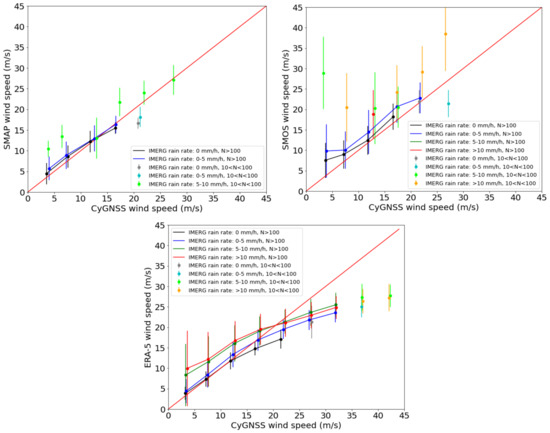 Any potential effects of the rain onto the CyGNSS measurements are first investigated while using the wind retrievals from the L-band radiometers SMAP and SMOS as reference, as it is claimed that these are unaffected or affected little by rain e.g., [44,45]. The reasons provided to justify minimal contamination by rain effects would similarly apply to CyGNSS GNSS-R measurement principle (i.e., little attenuation by rain droplets and small rain-induced roughness effects at L-band). The IMERG rain rate values that are co-located with CyGNSS measurements are used to bin the wind retrievals as a function of the rain rate. Figure 6 shows the batched means grouped by rain rate. Our variational CyGNSS wind retrievals show the same performance, within dispersion levels, as compared to SMAP and SMOS retrievals, regardless of the presence of rain up to 5 mm/h (heavy rain). The batches of co-locations with higher rain rates (heavy to violent showers) have been found to present a bias towards larger SMAP and SMOS wind retrievals, with larger biases for lower CyGNSS wind speeds. Nevertheless, none of the batches for rain rates above 5 mm/h present populations of statistically significant size (N < 100). For completeness, Figure 6-bottom shows the same rain-grouped statistics that were obtained for the comparison with ERA5. A similar residual effect that is linked to the presence of rain can be observed, with a larger impact on low wind speeds.