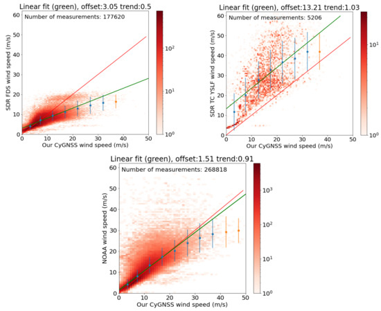 2D Histograms of the comparison between our CyGNSS wind speed estimates (X-axis) and those provided by other organizations (Y-axis). (Top row): wind retrievals from the official CyGNSS data server, PODAAC (SDR Version 3.0), for FDS (left) and YSLF (right). The overall bias (standard deviation) are 1.1 m/s (3.2 m/s) and −13.8 m/s (9.9 m/s), respectively. (Bottom panel): CyGNSS wind retrievals from NOAA, with overall bias (standard deviation) −0.8 m/s (3.1 m/s). Superimposed to the histograms, the 1:1 diagonal (red line), the linear fit (green line), and batched mean and dispersion (dots with errorbars, blue when the number of samples in the batch exceeds 100, and orange when it does not reach 100 samples).