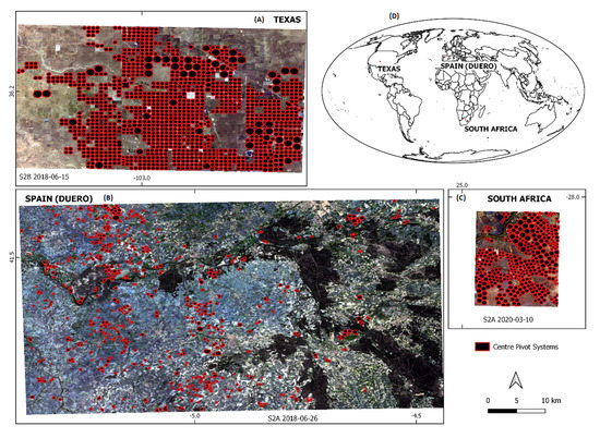 Of course, it would be possible to simply compensate for the missing invariances by extending the training dataset to all three study areas. However, this only shifts the problem of lacking geographical transferability, since, more or less, all areas with CPSs at the global level would then presumably have to be included, which in turn would mean a great deal of manual mapping effort. Since this is clearly contrary to the goal of keeping manual invention to a minimum, we propose to train a minimum number of networks, each applicable to specific, similar regions in terms of land-use pattern and CPS characteristics. These could be expressed by land-use clusters. For example, in this study, two clusters could be defined: (i) CPSs located in dry climates (Texas and South Africa) and (ii) CPSs located in semi-arid regions embedded into complex agricultural patterns (Duero). Thus, a separate network would have to be trained for Spain; the network from Texas, on the other hand, could also be used operationally in South Africa. By using the Shannon Entropy and comparing other geographical factors (e.g., vegetation patterns, crop types, and rotation, average field size, number of land uses) similarity between geographic regions could be expressed. The number of different networks required for global coverage would only have to be as large as the number of identified clusters. However, this clearly requires further research beyond the scope of this work.