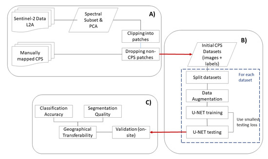While these studies highlight the potentials of DL-based approaches and particularly U-NET for mapping CPS, some open points remain: Firstly, given that U-NET shall one day replace human experts, it has to be capable to deal with contrasting geographic locations and provide constantly high segmentation and classification accuracy. Research on the geographic transferability of DL approaches, however, is still at its infancy. In a comprehensive review on deep learning methods in remote sensing, Zhu et al. [25] conclude that the transferability of models trained on geographically limited datasets to the global scale is an ongoing challenge. Since CPSs can be found in many parts of the world, the question arises as to how well a model trained on a single study area performs when transferred to geographically contrasting areas. Arguably, this aspect is crucial for the applicability of U-NET to wider areas and will be decisive when attempting to replace human experts. Secondly, most deep learning implementations in remote sensing only use a small amount of the available spectral information (see, e.g., References [26,27]). The visible bands of remotely sensed imagery obtained from sensors like Sentinel-2 MSI are spectrally highly correlated [28] and only provide limited information about vegetation characteristics but are often used in DL studies. Since the usage of a higher number of spectral bands would significantly increase computational requirements, we investigated the effects of using the wide-spread principal component analysis (PCA) approach for spectral dimensionality reduction [29], on U-NET CPS classification and segmentation accuracy.