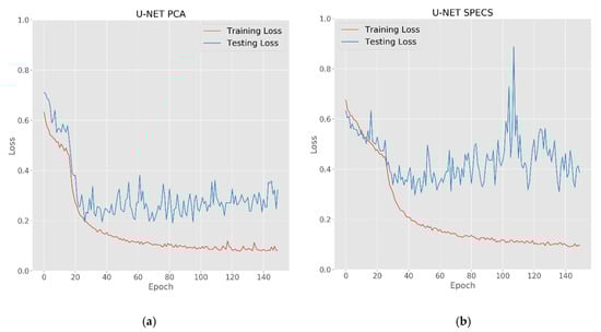 U-NET training (orange) and testing (blue) loss per epoch for both U-NET configurations, showing U-NET PCA (a) and U-NET SPECS (b).