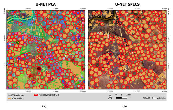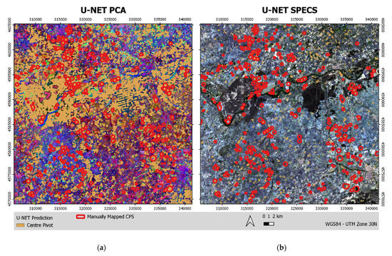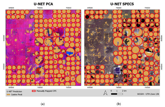 Figure 4 displays the results of the semantic segmentation for the part of the Texas study area used for validation. The results from U-NET PCA are shown on the left side of Figure 4 and the results from U-NET SPECS on the right side. U-NET PCA reproduced the smaller CPSs, in particular, with high quality, and it had only occasional omissions. However, the larger CPSs, which are located central in the map, were only fragmentarily mapped by U-NET. In the western part of the area, which has no CPSs, some false positives can be found.