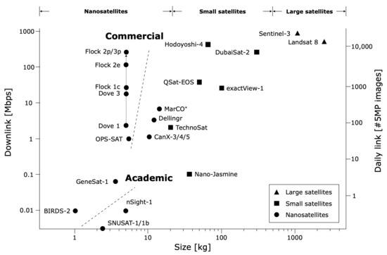 Nanosatellite is a classification of small satellites ranging from 1–10 kg. Multiple nanosatellites can be operated as a constellation due to its low cost, allowing missions to achieve high spatial resolution by multipoint observation and high temporal resolution by short revisit time. Due to these reasons, nanosatellites have been used in various missions [1] such as atmosphere exploration [2] or remote sensing applications [3,4]. Especially in remote sensing, recent nanosatellites have been delivering 3.7 m resolution images [5]. Combining such imaging performance with the advantages of nanosatellites opens a new space era allowing near-real time global coverage Earth observation capabilities. However, nanosatellites have limited resource (i.e., electrical power or payload mass/volume) due to its size compared to conventional satellites, restricting nanosatellite operations related to electrical power or data downlink capability. According to Figure 1, although many commercial application nanosatellites have achieved high data rates, yet many of the academic nanosatellites do not have access to the high-end transmitter or ground station facilities, which limit typical nanosatellite systems in downlinking only a few images daily.