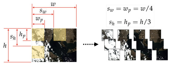 However, as discussed by Jeppesen [29], loss in the outermost boundary of the input due to lack of information outside of the boundary becomes a larger problem when using patch decomposition. Jeppesen proposes cropping out the boundaries where the most uncertainty lies. Considering the cropped pixels against the total pixels of the image with a size of , the ratio is given as Equation (2).