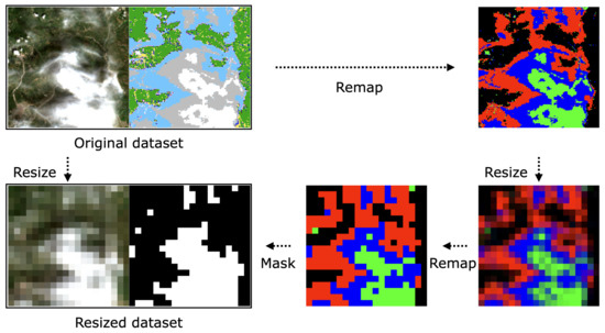 To overcome the resize problem, the SCL patch is reconfigured such that features of interest are distributed to each of the channels of the image. If multiple features share a channel, it would be difficult to decompose the features after the resize. In this study, as we are only interested in thin cirrus, high probability cloud, and medium probability cloud, the three labels are remapped to the red, green, and blue channels. The resize process is shown in Figure 8.