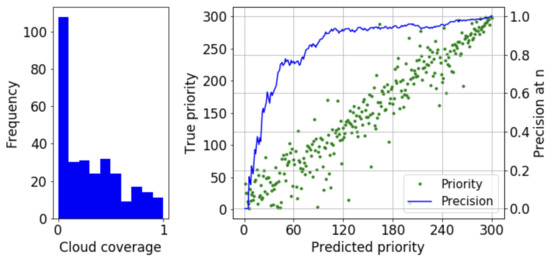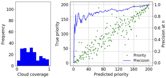 The histogram on the left of each figure shows the cloud coverage distribution of the dataset with an interval of 10%. Examining both figures, although it may seem that the performance of the proposed method is low at higher priority images, considering the frequency of the clear images, the practical performance is satisfying. In Figure 10, the number of the top 10% clear images in the dataset is 108, and the precision at 108 is higher than 90%. Considering a downlink capability of 10 images daily, despite the low precision of approximately 10% at 10, all data are clear images. In Figure 11, although the dataset has less clear images in the top 10%, the precision at 10 is approximately 70%. From the results, we can expect the proposed method to be satisfactory also in environments with frequent cloud images [23]. Despite the expectations, the dataset in Figure 10 is used throughout the study to evaluate the proposed method with higher sensitivity.