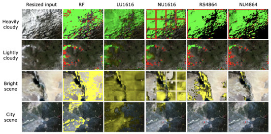 Selected segmentation results for heavily cloudy, lightly cloudy, bright, and city scenes (RF: Random Forest, LU1616: Zhang’s method, NU1616: Proposed method with patch decomposition, RS4864: Jeppesen’s method, NU4864: Proposed method without patch decomposition). Green, red, and yellow represent true positive, false negative, and true negative, respectively.