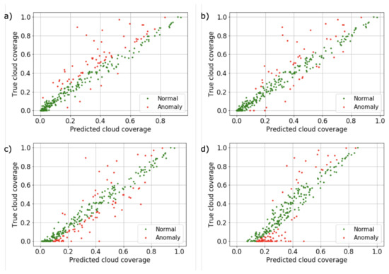 Cloud coverage prediction error depending on CNN models with anomaly points for error distances larger than . (a) NU-Net (proposed) without patch decomposition, (b) RS-Net (Jeppesen, 2019) without patch decomposition, (c) NU-Net (proposed) with 16×16 patch decomposition, and (d) L-Unet (Zhang, 2019) with 16×16 patch decomposition.