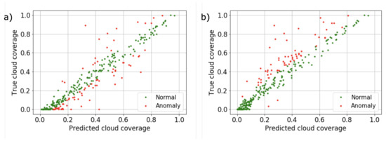 The characteristics shown in Figure 13 are well represented in Figure 14, in which shows the comparison results of predicted cloud coverage against true cloud coverage. The red dots in Figure 14 represent anomalous data, in which the distance between predicted cloud coverage and true cloud coverage is larger than . It can be clearly seen that NU-Net without patch decomposition (Figure 14a) and RS-Net (Figure 14b) have good performance throughout clear images. In contrast, the majority of anomalies are populated in overestimation of clear images in the case of L-Unet (Figure 14d). The NU-Net with patch decomposition (Figure 14c) method slightly overestimates cloud coverage due to the padding effect related to the increase in the border ratio.