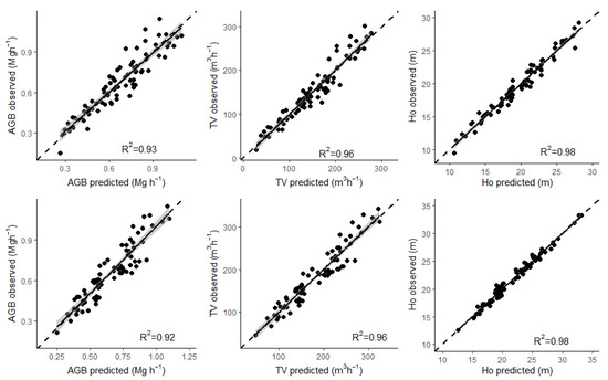 Plots of model predictions versus the observed data are shown in Figure 3. Relationships between observed and estimated AGB, TV, and Ho consistently exhibited R2 values exceeding 0.93.