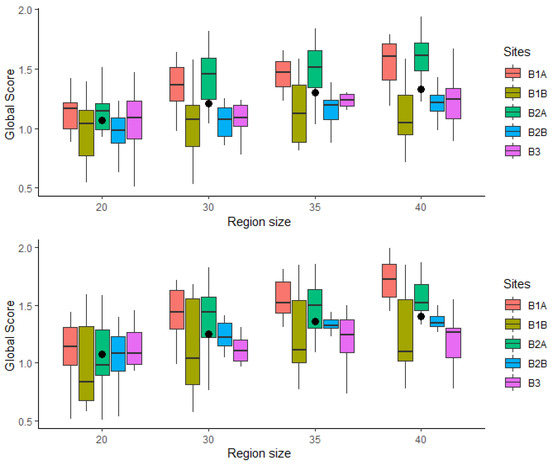 To evaluate the effects of region size on the GS values from different combinations of range, boxplots of spatial radius versus region size were assessed (Figure 5) for AGB and TV. For small region sizes, the behavior of the GS was quite uniform either applying segmentations obtained using TV or with those obtained using AGB. Differences among sites increased as the size of the region increased. The largest difference was observed for a size of 40, in both the TV and AGB segmentations. B1B had greater variability of GS than the rest of the sites for AGB and TV, this being more pronounced for AGB. For the TV segmentations, site B2A had the highest values of GS, for all sizes, while for the AGB segmentations site B1A had the highest values of GS, for all sizes; in both cases, this was more evident in the larger regions.