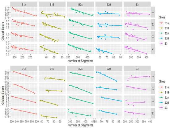 The relationship between segment number and global score is shown in Figure 6 when the range radius was fixed at 4.