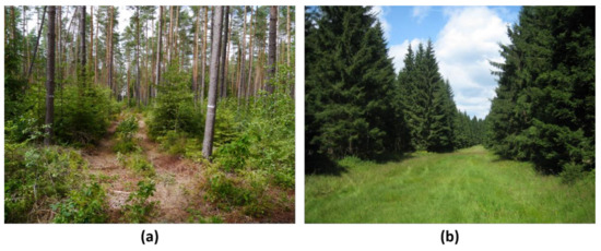 Two study areas were considered, both located in the Free State of Thuringia, central Germany (Figure 1). The first study area is the catchment area of the Roda river in eastern Thuringia, with a size of about 260 km2. The valleys of the Roda and its tributaries create areas with steep slopes (up to 63°) in the otherwise relatively flat study area (mean slope: 8.61°). The climate is temperate, with relatively warm summers and mild winters. The annual mean temperature is around 8.5 °C, with a mean annual precipitation of around 600 mm [17]. About 50% of the area is covered by mostly planted and intensively managed forests (Figure 2), which are dominated by Norway spruce (Picea abies) and Scots pine (Pinus sylvestris), sometimes mixed with European larch (Larix decidua), birch (Betula pendula), and European beech (Fagus sylvatica). The rest of the study area is mainly comprised of agricultural areas (fields and grassland) and urban areas. In parts of the forests, trees stressed by drought periods in 2018/19 were logged off in June of 2019 [18].