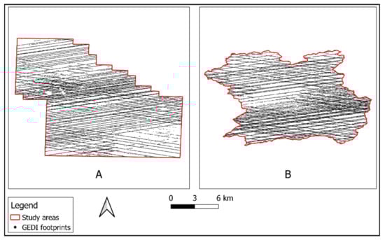 Distribution of GEDI footprints used in this study within the Thuringian forest study area (A) and the Roda study area (B).