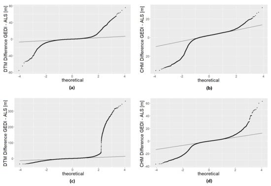 Quantile-quantile plots showing distributions of: (a) DTM-differences, Roda area; (b) CHM-differences, Roda area; (c) DTM-differences, Thuringian forest area; (d) CHM-differences, Thuringian forest area.