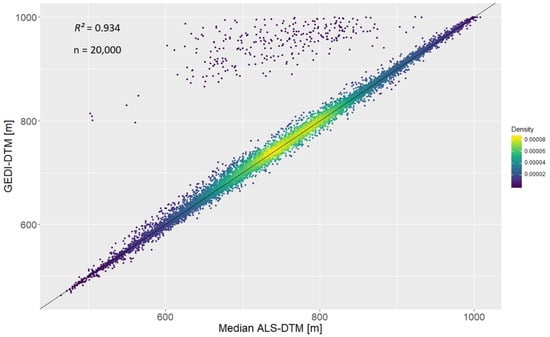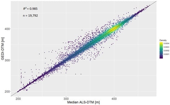 The scatterplot of GEDI-DTM and ALS-DTM values shows a strong linear relationship (R2 = 0.985), with some outliers in the lower and medium elevation range (Figure 5). The median of the DTM-differences is −0.259 m, with a MAD of 1.67 m. 13.1% of the measurements have a DTM-difference whose distance to the median DTM-difference is more than 3 times the MAD.