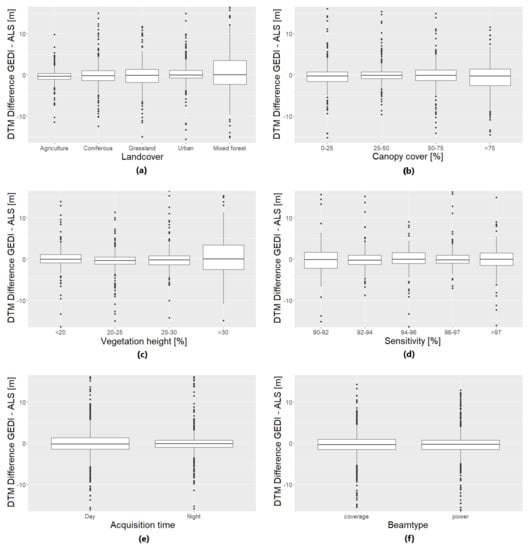 Boxplots of the differences between GEDI and ALS ground elevation estimates depending on: (a) land cover; (b) canopy cover; (c) vegetation height; (d) beam sensitivity; (e) acquisition time; (f) beam type. Lower and upper hinge of the boxes indicate the 25th and 75th percentile of the data, respectively.
