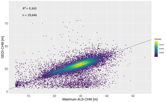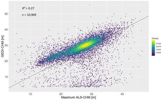 Scatterplot of GEDI canopy height estimates and the maximum of the ALS-CHM of each footprint (Thuringian forest study area).