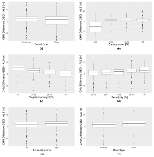 Boxplots of the differences between GEDI and ALS canopy height estimates depending on: (a) forest type; (b) canopy cover; (c) vegetation height; (d) beam sensitivity; (e) acquisition time; (f) beamtype. Lower and upper hinge of the boxes indicate the 25th and 75th percentile of the data, respectively. Note the increased y-axis value range of the canopy cover boxplots.