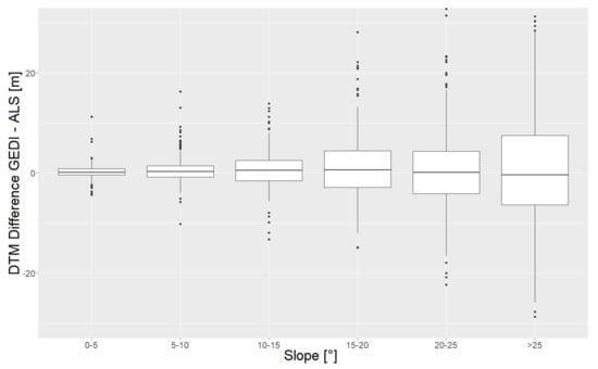 Figure 10 shows the relation between GEDI-DTM accuracy and the median slope within each footprint in the Thuringian forest study area. Similar to the Roda area boxplots, some extreme outliers are not depicted. While the median of the DTM-differences changes relatively little with increasing slope, the MAD continuously increases with each slope class.