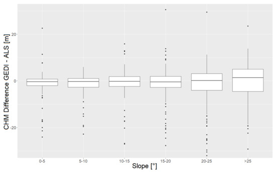 Boxplots showing the differences between GEDI and ALS canopy height estimates depending on the median slope within the footprint (Thuringian forest study area). Lower and upper hinge of the boxes indicate the 25th and 75th percentile of the data, respectively. Some extreme outliers (0.39% of the data) outside of the y-axis value range are not depicted.