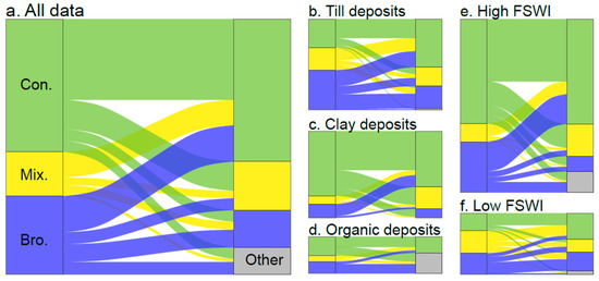 Transition diagrams in forest cover classes from 1930s (left) to 1990s (right) for all data (a), by deposits classes (b–d) and by fire severity weather index classes (FSWI; e,f). Forest classes are coniferous (green), mixed (yellow) and broadleaved (blue) and other non-forested (gray; exclusively wet barrens and alder swamps). The size of individual diagrams in (b–d) and (e,f) are proportional to the representation of surface deposits and fire severity classes in the sampled sites.