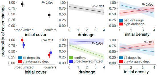 Results of overall probability of cover changes modeling. The plots show the predicted values and 95% confidence intervals obtained with the selected linear mixed model that account for initial forest cover, sites characteristics and their interactions (R2fixed = 0.30; R2fixed+random = 0.43). Black and white plots show single effects while colored plots show interaction effects. Only significant (p < 0.05) effects and interactions are shown (except for forest initial density that had a significant but very weak negative effect). Drainage classes range from bad (0) to good (4), and initial tree cover density ranges from low (1; 0–25%) to high (75–100%).