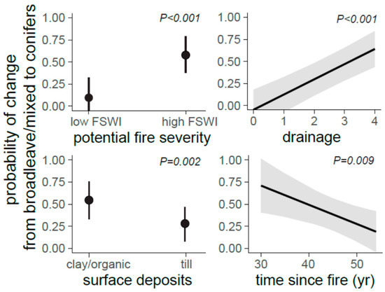 Results of modeling of the probability of change from broadleaved/mixed to coniferous cover. The plots show the predicted values and 95% confidence intervals obtained with the selected linear mixed model that account for sites and fire characteristics without interactions (R2fixed = 0.19; R2fixed+random = 0.49). Only significant (p < 0.05) effects are shown. Drainage classes range from bad (0) to good (4).