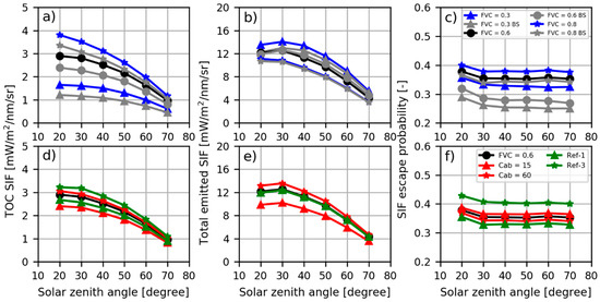 DART-simulated Top of Canopy (TOC) SIF (a,d), total emitted SIF (b,e), and corresponding SIF escape probabilities (c,f). BS means black soil (i.e., non-reflecting background). The label -●- indicates the default configuration (fractional vegetation cover (FVC) = 0.6, chlorophyll content (Cab) = 35 μg/cm2, Ref-2). The top row refers to varying canopy structure, and the bottom row refers to variable leaf and background spectral properties.